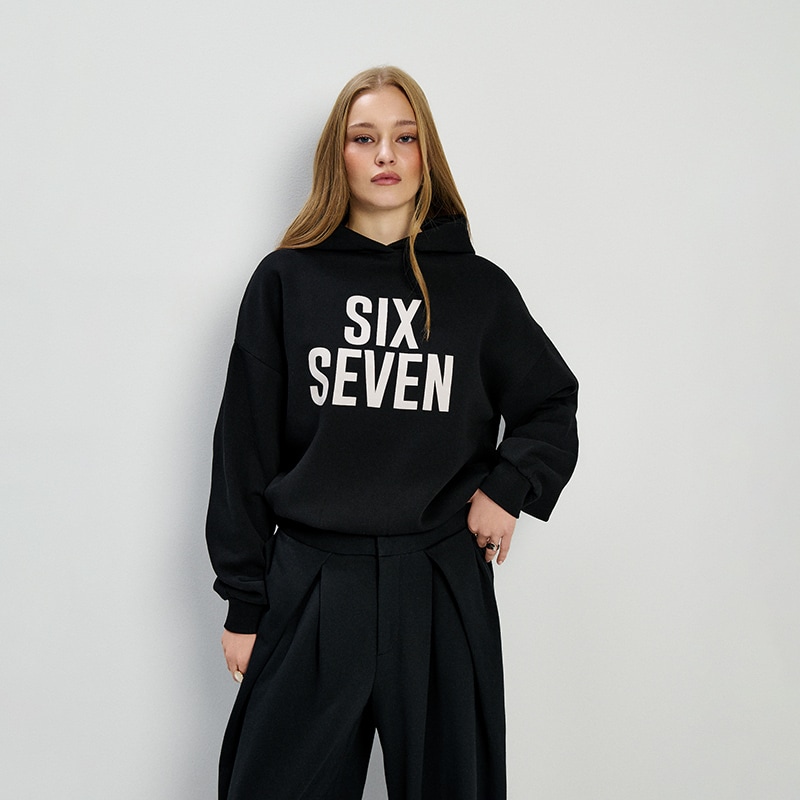 kroj loose fitsa kapuljačomdugi rukavitekstualni printspuštena linija ramenarubovi završeni porubimaVisina modela: 177 cm crno3.599 din